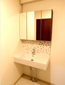 洗面台と三面化粧鏡を敢えてセパレートに・・壁のモザイクタイルが可愛いでしょう。
