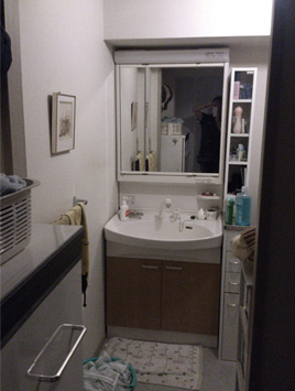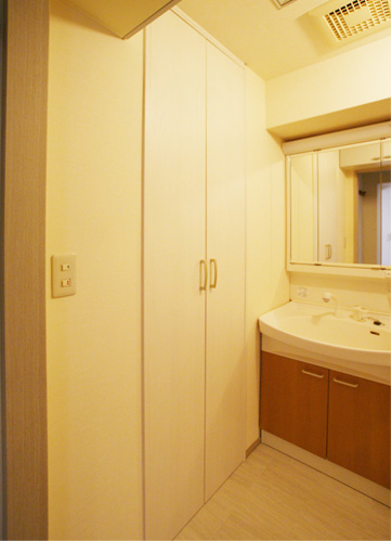 洗面台は既存再利用ですが、リビングのクローゼットの一部を利用して洗面台左側にタオルや洗剤などの収納を新設しました。