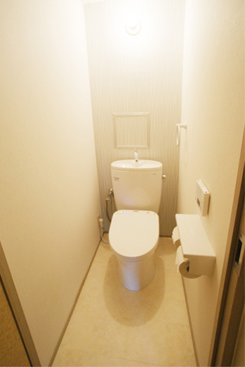 TOTOピュアレストEX採用。トイレはシンプルで清潔なイメージで、機器とクロスをホワイトでまとめました。正面の壁だけ、こちらも主張しすぎないアクセントクロスですっきりと上品に仕上がりました。