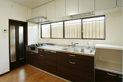 吊戸をホワイトにすることで天井と同化し、圧迫感を感じさせない広々とした印象のキッチンに。