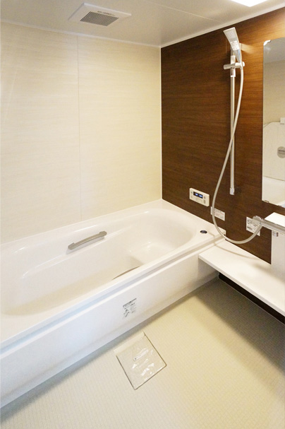 長時間車を運転されるご主人様の「癒しの場所」という事で、唯一意見を出された場所です。足を延ばしてゆっくりお風呂に入りたいというご要望にお応えさせて頂きました。1216サイズだったお風呂を廊下側に40cm拡張し、1616サイズにしました。出来上がったお風呂を見て、喜びのあまり涙ぐまれる・・・という場面もありました。(*^-^*)
