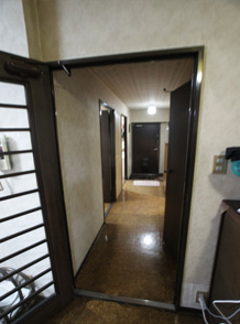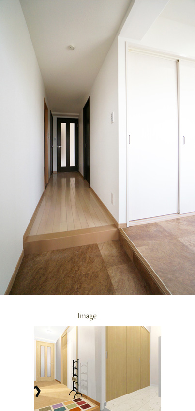 マンションの構造上、元の土間とフラットに出来なかったのが残念ですが、土間の仕上げ材を同じ柄にしているので、統一感のある玄関になりました。