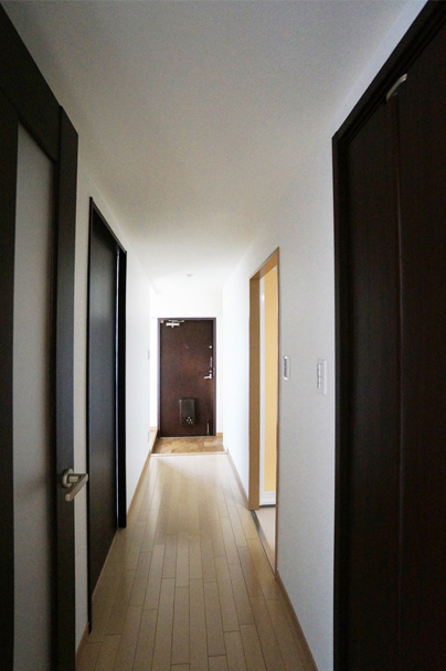 扉はダークブラウンで引き締まった印象に。間仕切り引き戸と収納扉はホワイトにして、圧迫感のないスッキリとした空間になりました。