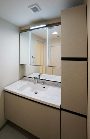 マンションでは少し大きめの1418サイズのユニットバスと、1450間口2ボールの洗面化粧台の入替えのご依頼を頂きました。現地調査の結果、1618サイズのユニットバスが入りそうなので、サイズアップでご提案させて頂きました。W様が前もってショールームで商品を選定済みだったので、素早く話が進みました。ゆったりと過ごせる大きくなったお風呂と、ボールを減らして収納を増やした洗面所で快適・ラグジュアリなバスタイムを過ごせそうですね。