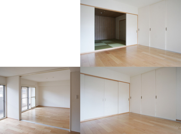 右下:扉を全て閉めると洋室に。圧迫感を出さない為に扉は全てホワイトにしました。