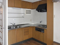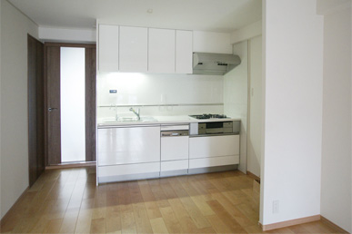 L型のキッチンが入っていましたが、ダイニングスペースとリビングスペースの取り合いを検討した結果、