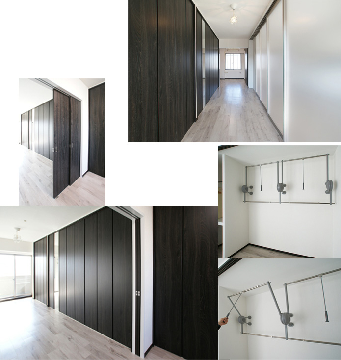 写真右下は上下2段に服がかけられる、昇降式ハンガーパイプ。