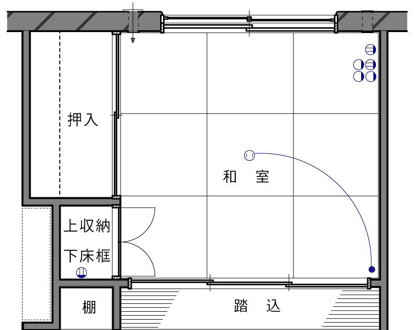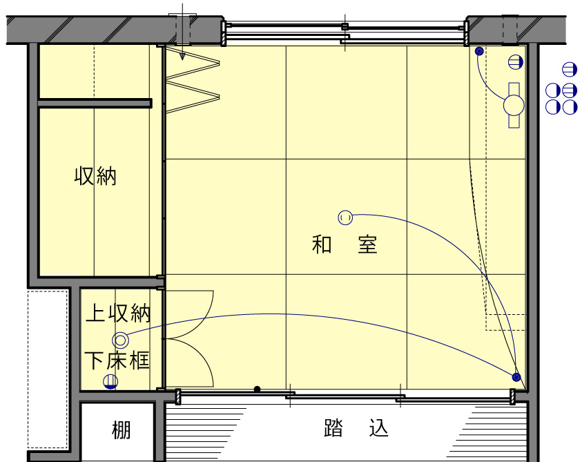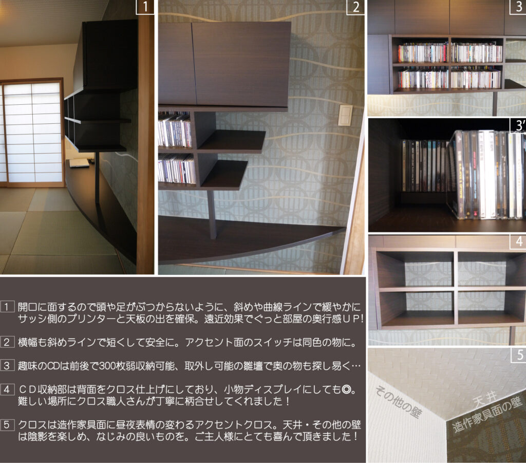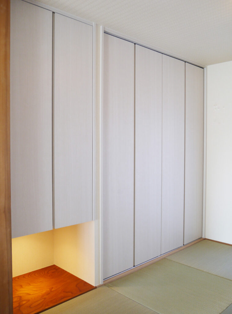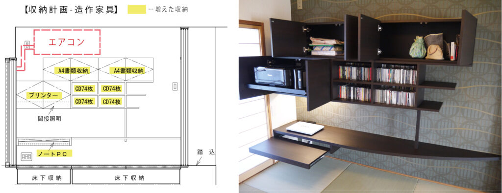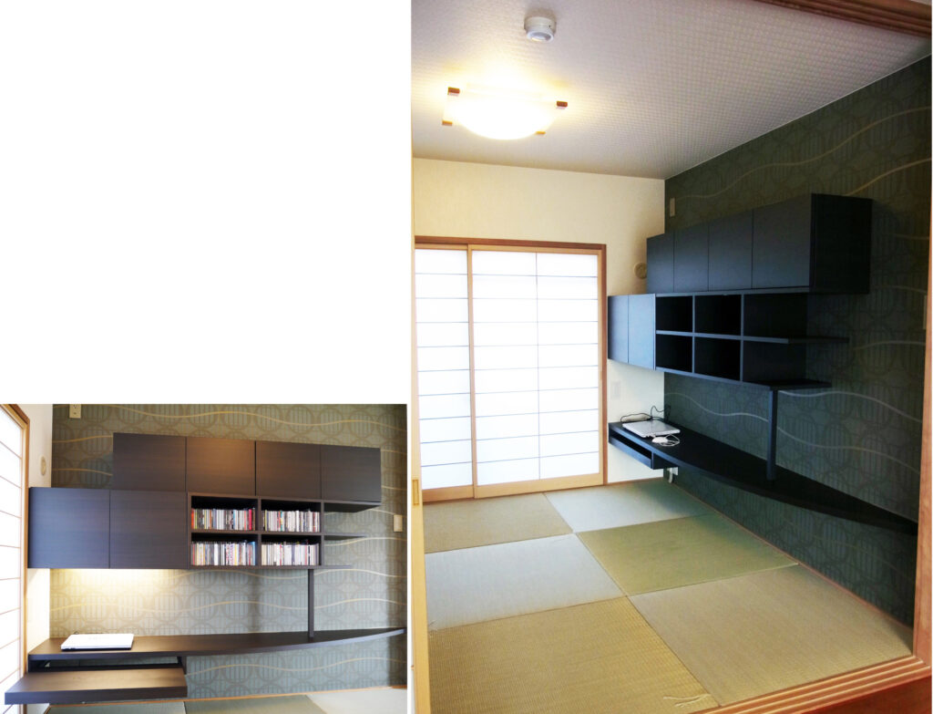 造作家具部分はご主人様、旧押入部分は奥様がメインの物を収納することで、気配を感じながら、お二人同時に和室で作業できます。