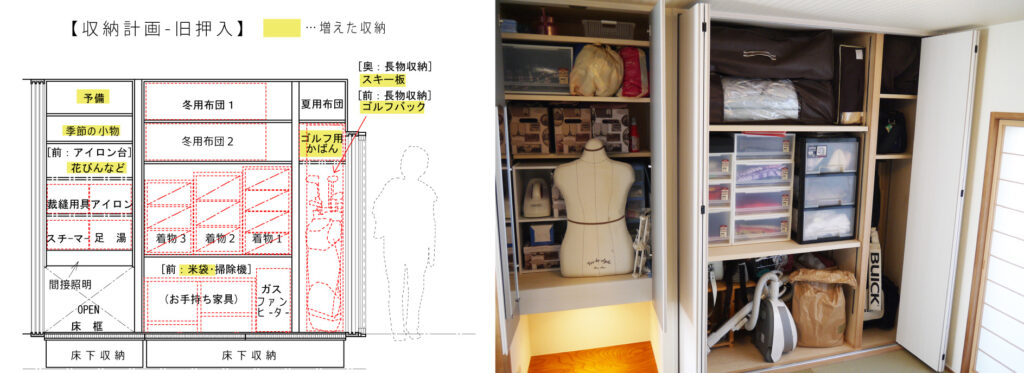 元々あった押入も無駄なく使っていらっしゃる収納上手なお客様でしたので、より効率よくフレキシブルに使えるようにプランさせて頂きました。
