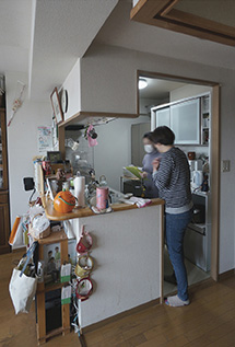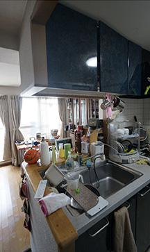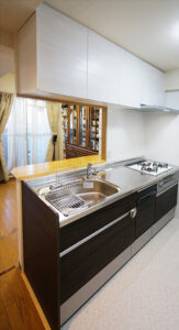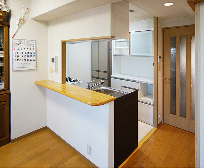 既存キッチンがL2070と規格サイズではなかったため袖壁を一部撤去して、L2100のキッチンを設置しました。