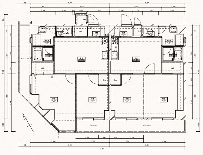 同じような間取りが反転して並んでいる一般的なファミリー向け賃貸マンション。