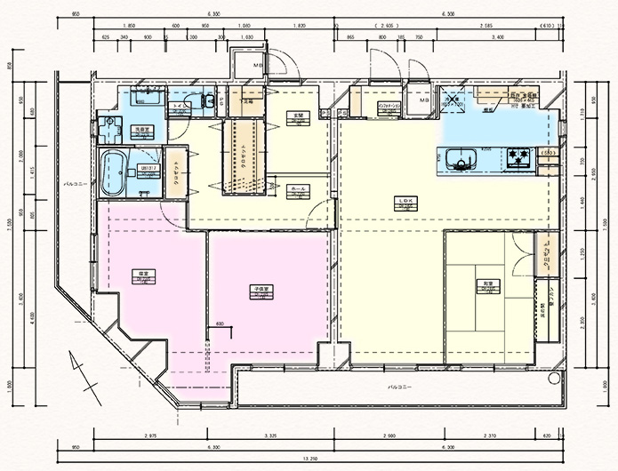 図面右側広いLDKの和室はロールスクリーンで区切って客間になります。