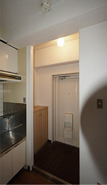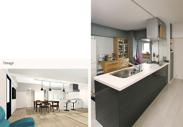 Before写真のキッチンの左側が木製の壁になっていて隣のお部屋と繋げることができるようになっています。