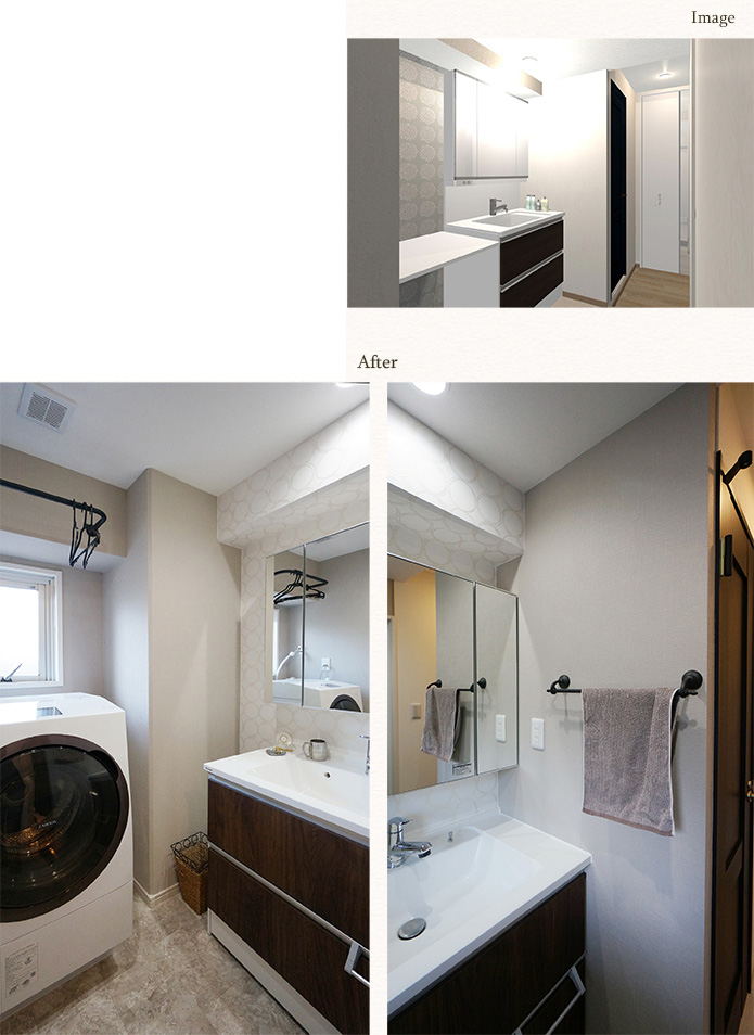 シンプルな洗面化粧台にアイアンのブラックがアクセントになっています。