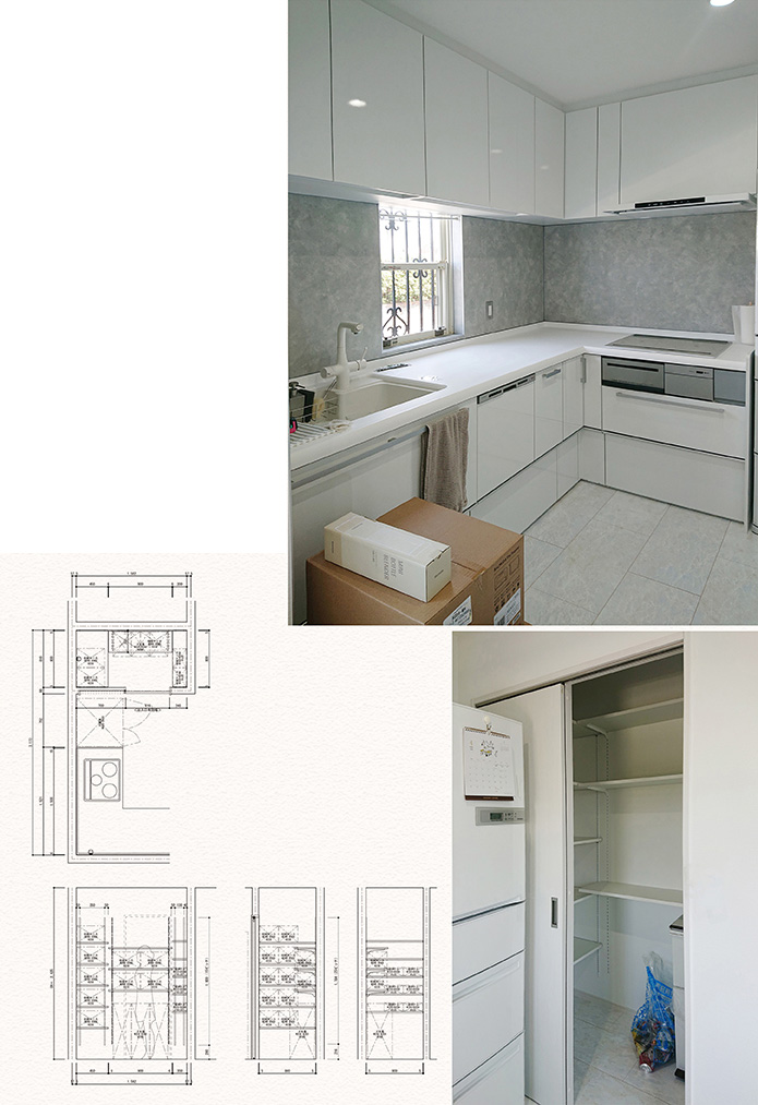 分別ゴミ箱や細々としたストック品が納まる、引戸付きのパントリーや、真っ白のキッチンを引き締めるグレーのキッチンパネルなど、奥様の夢がぎゅっと詰まった素敵なキッチンになりました。