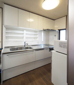 建設前の設計では、キッチン前に窓が付く予定でしたが、お隣の窓と干渉することが判明し、急遽収納スペースに変更になったそうです。