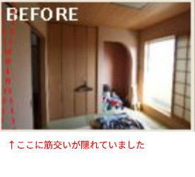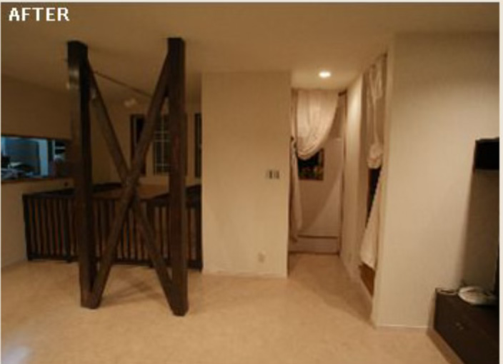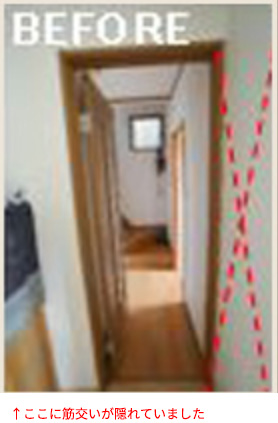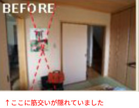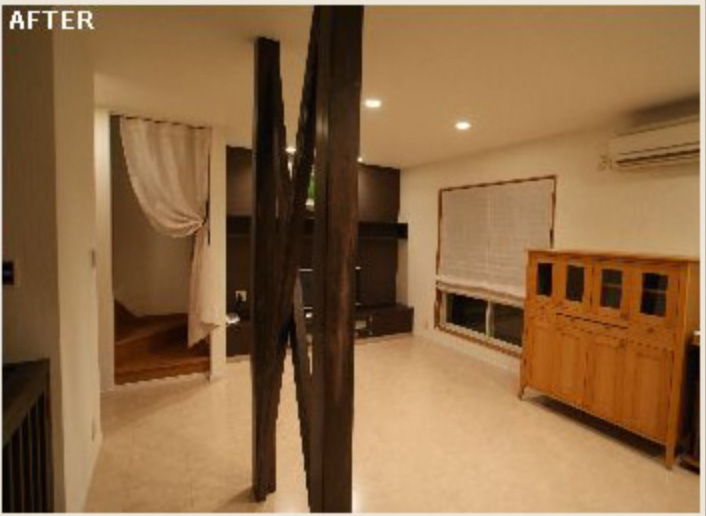 建築図面に記載なかった部分に撤去時に筋交がでてきました!こんな事はリフォームでは日常茶飯事。早速お客様と相談し、筋交の形状を残し「エイジング塗装」で古材風に仕上げることに・・