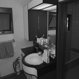 リゾートホテルのような雰囲気にしたいとのご要望でした。濃い木目のカウンターに清潔感溢れる白いボウルで、イメージどおりのワンランク上の洗面化粧台になりました。