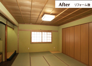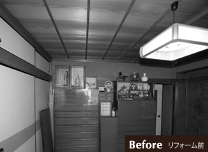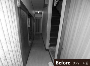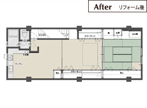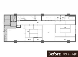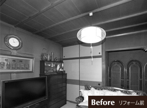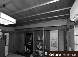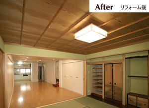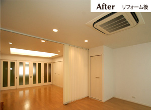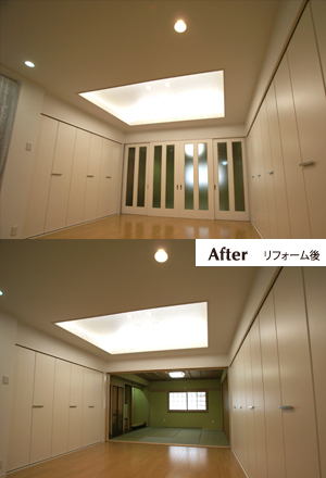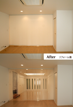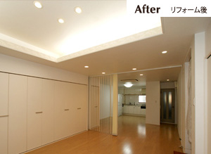 腰窓が2つ有るだけの暗い1フロアを、とにかく明るくしたい!とのご要望でした。窓からの明りが届かない中央部分は間接照明を使い、やわらかい光で自然な明るさに。床以外を白で統一し、さらに明るさUPです!壁面にはたっぷりと収納をとったので、もう収納場所に困りません。和室の扉はフルオープンでき、ひろびろ1ルームとして使ったり、縦型ブラインドで3部屋に区切ることも出来るので、ライフスタイルに合わせて末永く使えます。