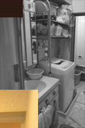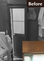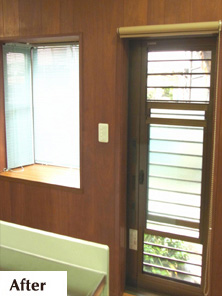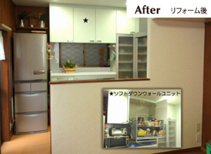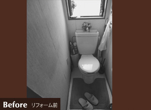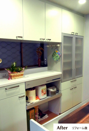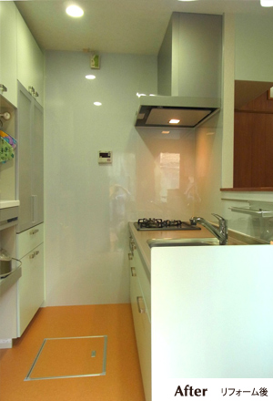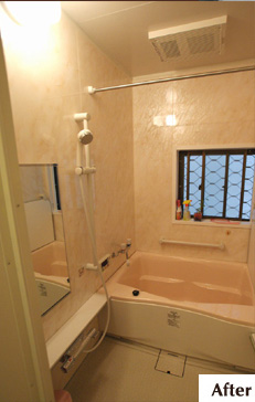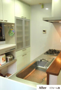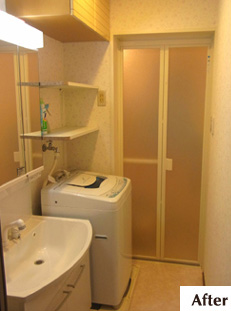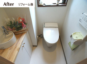 タイル貼のお風呂をユニットバスに入替え、トイレは拡張して手洗いカウンター付きタンクレストイレに。開きだった勝手口は通風型の引戸に。