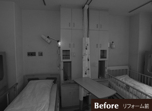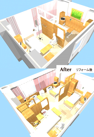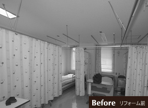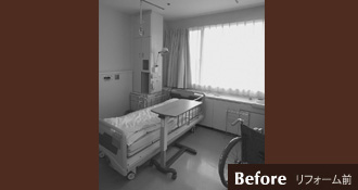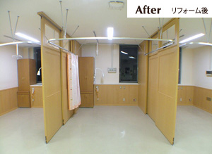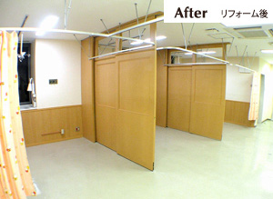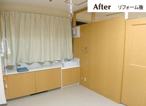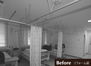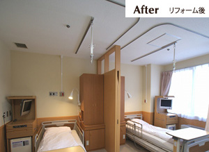 しっかりとした間仕切を造ることで患者様のプライバシーを確保して「もっと快適に療養して頂きたい」と一部の病室を個室の様な空間にしました。