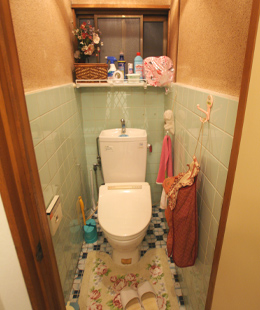 節水もさることながら、最近腰に貼ってあるタイル目地の汚れが気になるとのことで、今回は節水型便器の入替と腰タイルを清潔なパネルに替えました。