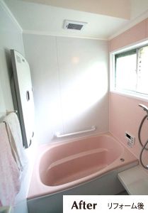 リビングも廊下も、昔ながらの木目の壁が 多用されていましたが明るいクロスに仕上げて 全体が明るくなりました♪浴室も浴槽が大きくなり、 全体にピンクでまとめたので楽しく可愛い浴室に。