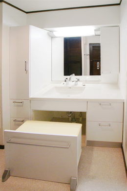ボウル下の収納は引き出してスツールとして使えるので、使いやすさに、ついついお化粧の時間が長くなってしまうかもしれませんね。